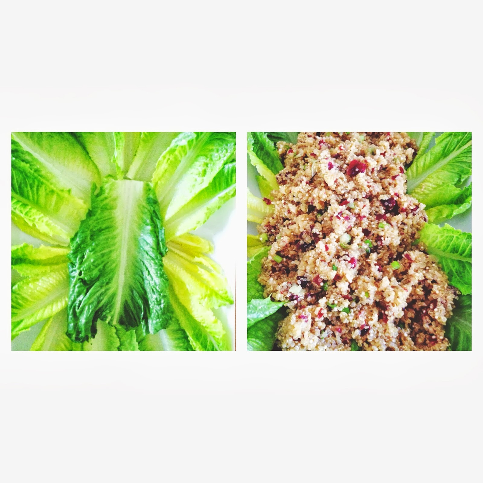 in a big bowl mix quinoa with 2 tbsp. olive oil and all chopped ingredients from step 2 place washed lettuce leaves on plate or platter spoon jeweled quinoa onto romaine lettuce leaves and ......enjoy!!!