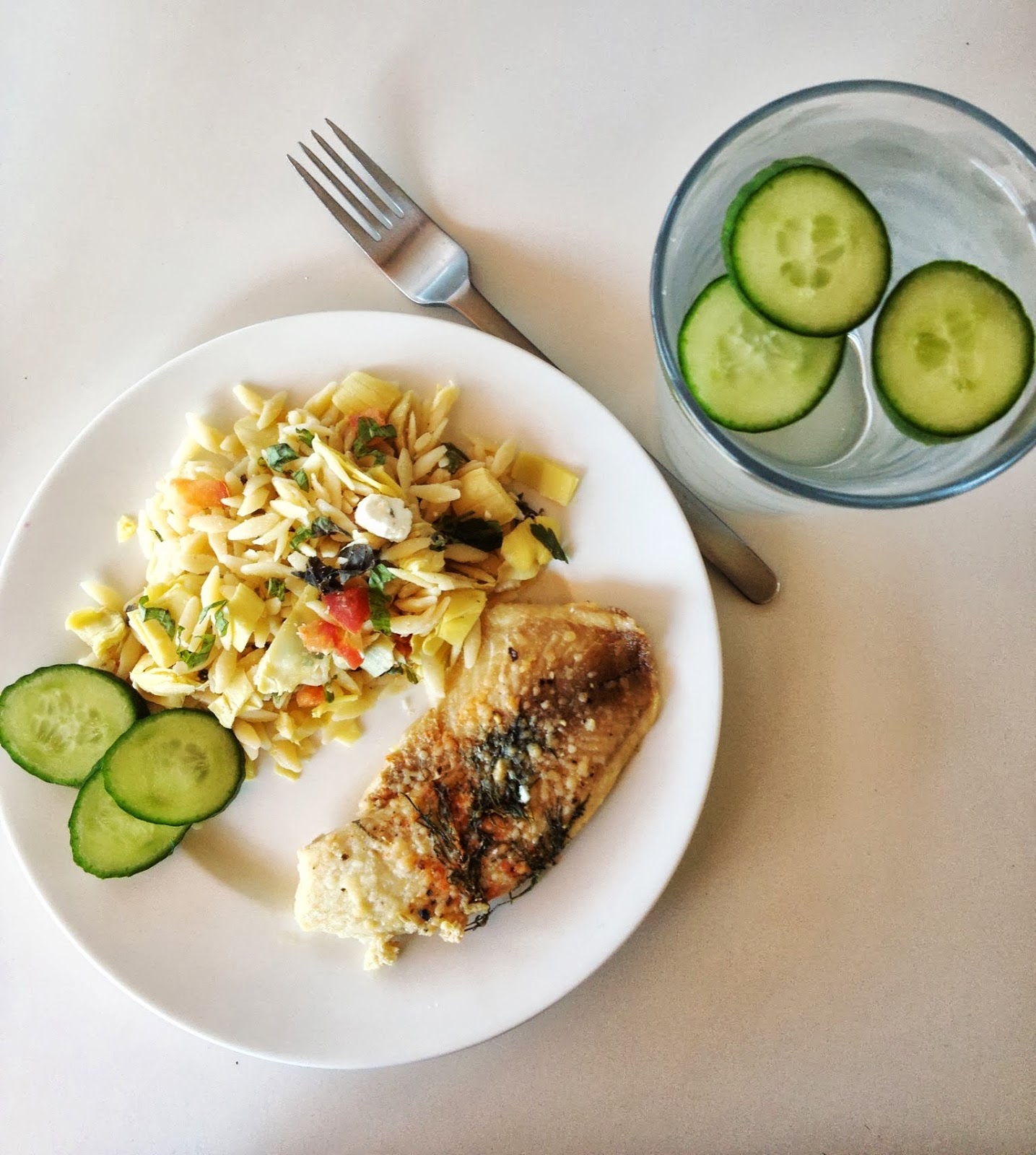 for last nights dinner i went "fridge diving"trying to find something light and quick. i ended up with a yummy Orzo mediteranean style side dish with baked tilapia. a great light dinner for a hot summer night. best of all leftovers turned into a quick school lunch for the kids [ omitting the fish] and secondly while the fish was baking and the orzo simmering i was able to walk our dog with Z. :) cant get better then that.