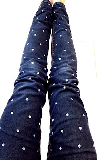 so originally this post got inspired by a pair of jeans i saw at anthropologie. i never tried them on as the price just blew me away $188. crazy! at home i checked online and found the Elliot Stiletto Crops with painted on polka dots. well guess what? i didn't even think about it twice i grabbed one of my extra pairs of skinnies and my paint supplies and 40 min. later i had my own polka dotted skinnies.